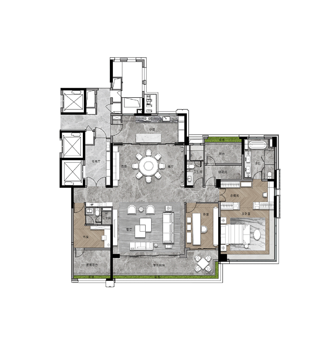 3T2户设想,有保姆电梯,保姆房:业从独梯入户,和保姆分隔,如斯低的梯户比,意味着舒服便利,同时了私密性。